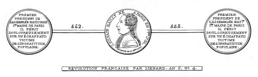 J. SILVAIN BAILLY NÉ A PARIS EN 7BRE 1736. (Jean-Silvain Bailly etc.) Buste de J. S. Bailly à gauche. Dessous: DÉCAPITÉ LE 12. 9 BRE. 1793. On aperçoit sur le bord du bras les traces du nom du graveur effacé.