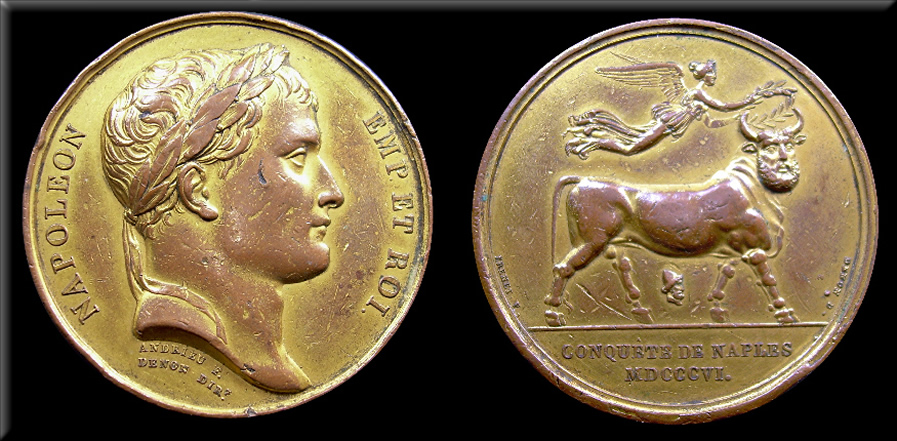 Obverse: Same as No. 103 Reverse: A bull with human head, crowned by a winged female figure. Under the bull, a head of Vulcan. BRENET F. DENON D. Exergue: CONQUÊTE DE NAPLES MDCCCVI. (P.M.). The type of the reverse is taken from the ancient coins of the city of Naples. The head of Vulcan, under the bull, alludes to the volcano of Vesuvius. The French army entered Naples on the 15th February, 1806, under the command of Prince Joseph, afterwards made king. |