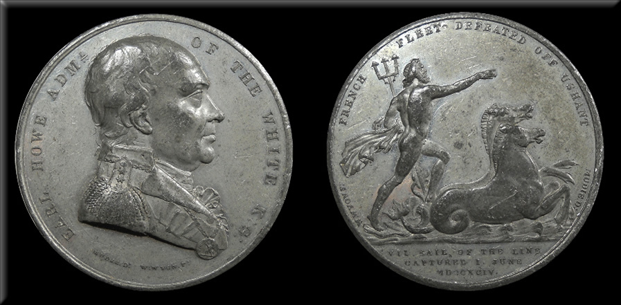 Rev. Neptune standing in a marine car. FRENCH FLEET DEFEATED OFF USHANT. In exergue: VII SAIL OF THE LINE / CAPTURED I JUNE / MDCCXCIV |