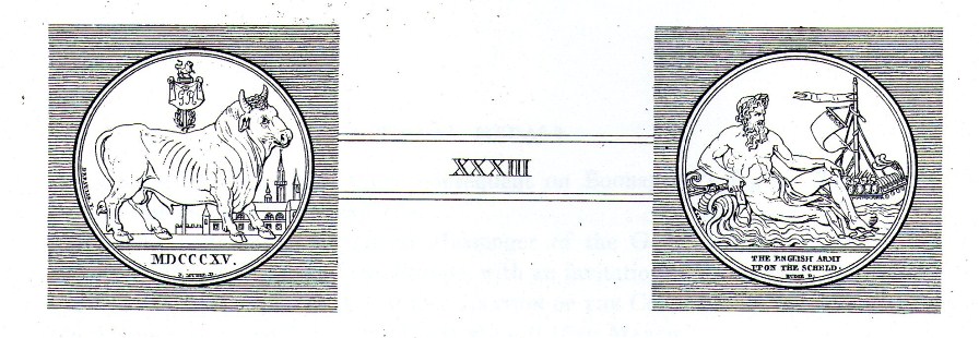 ...OBVERSE. - The Bull, a noble but common animal of the Netherlands, together with the peculiar buildings (Brussels) in the back ground, denote the Low Countries, and the British Standard planted on its ground, the establishment and success of the British arms there in 1815.