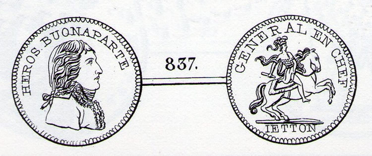 HEROS BUONAPARTE. Buste du général Bonaparte, à droite. GENERAL EN CHEF. Le général en chef Bonaparte, vêtu à l'antique, tenant le bâton de commandement, et à cheval, allant à droite. Exergue: IETTON [25 m ]. |