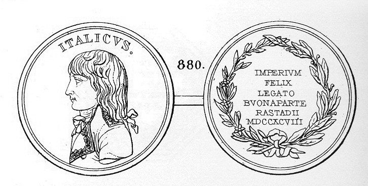 ITALICVS (L'Italique). Buste du général Bonaparte, en uniforme, à gauche. Dans une couronne d'olivier et de laurier: IMPERIVM FELIX LEGATO BVONAPARTE RASTADII MDCCXCVIII. (La France heureuse par la mission de Buonaparte à Rastadt 1798.) [40m]. |