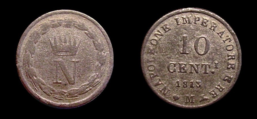 Obv.: Crowned N within laurel wreath Rev.: In the field: 10 CENT.I 1813. Around: NAPOLEONE IMPERATORE E RE. Below, M between pomegranate and oil lamp Mm. 18, grs. 1,9 |