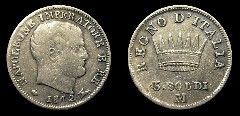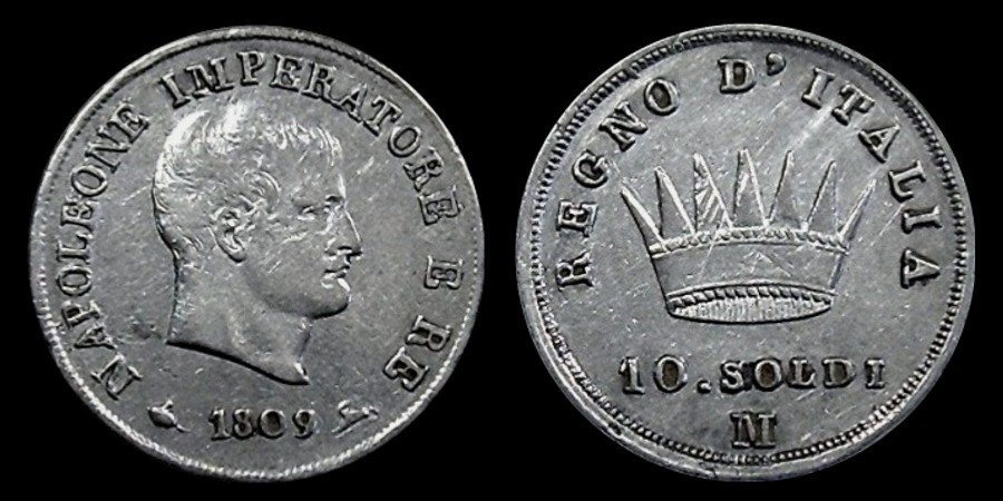 Obv.: NAPOLEONE IMPERATORE E RE. Below, pomegranate, 1809 and oil lamp. Rev.: In the field: Iron Crown. Above, REGNO D'ITALIA. Below, 10. SOLDI and M. |