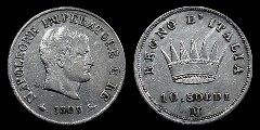 Obv.: NAPOLEONE IMPERATORE E RE. Below, 1808 and M in two lines, between pomegranate and oil lamp. Rev.: Napoleonic coat of arms. Around: REGNO D'ITALIA. Below, 1. LIRA Mm. 23,5, grs. 5 |