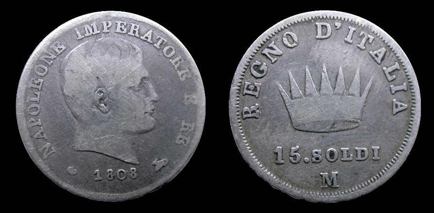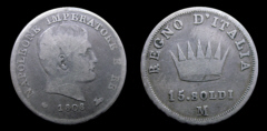 Obv.: NAPOLEONE IMPERATORE E RE. Below, pomegranate, 1808 and oil lamp. Rev.: In the field: Iron Crown. Above, REGNO D'ITALIA. Below, 15. SOLDI and M. Mm. 21, grs. 3,75 |