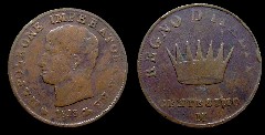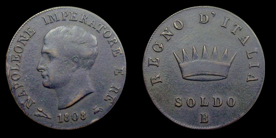 Obv.: NAPOLEONE IMPERATORE E RE. Below, oak branch, 1808 and oil lamp. Rev.: In the field: Iron Crown. Above, REGNO D'ITALIA. Below, 1 SOLDO and B. Mm. 27,5. grs. 10,95 |