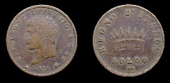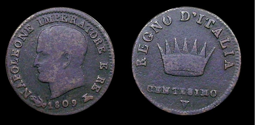 Obv.: NAPOLEONE IMPERATORE E RE. Below, anchor, 1809 and oil lamp Rev.: In the field: Iron Crown. Above, REGNO D'ITALIA. Below, 1 CENTESIMO and V. Mm. 19,5. grs. 2,1 |