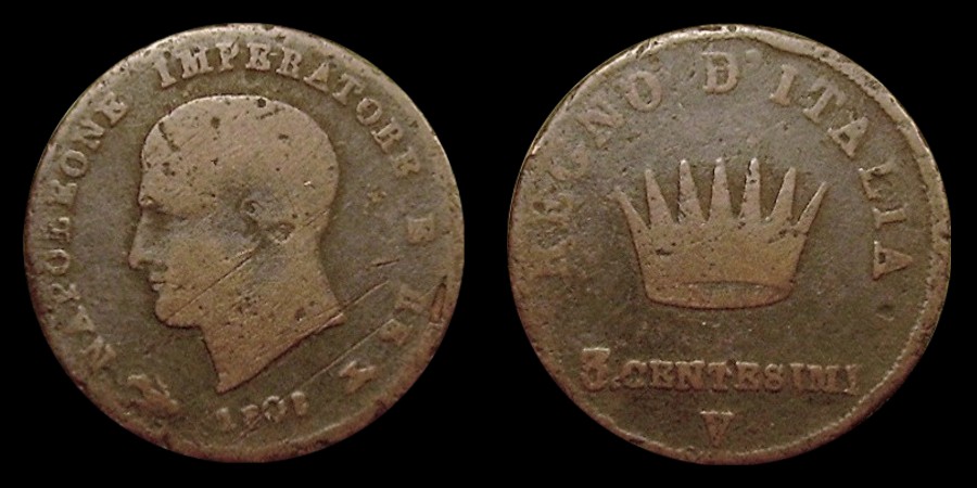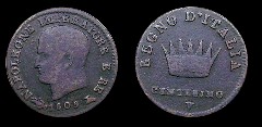 Obv.: NAPOLEONE IMPERATORE E RE. Rev.: In the field: Iron Crown. Above, REGNO D'ITALIA. Below, 5. SOLDI and M. Mm. 15, grs. 1,25 |