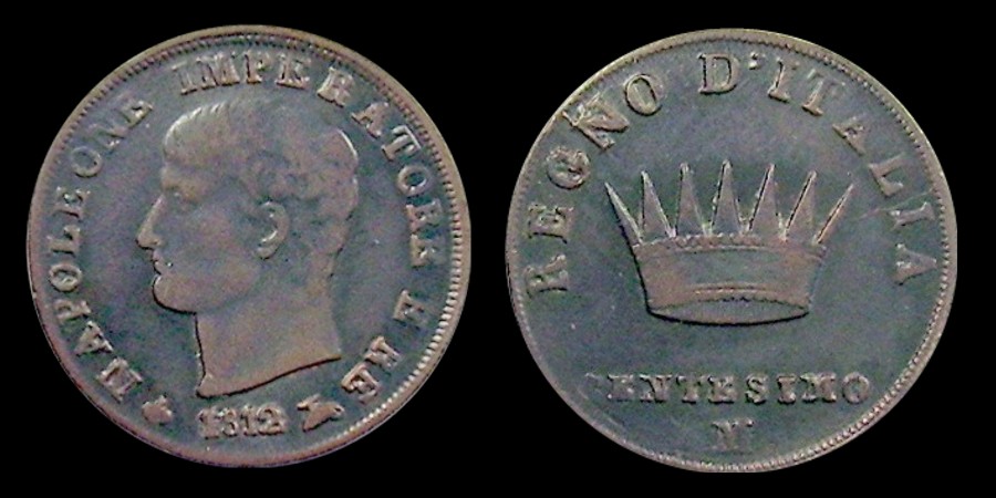 Obv.: NAPOLEONE IMPERATORE E RE. Below, pomegranate, 1812 and oil lamp. Rev.: In the field: Iron Crown. Above, REGNO D'ITALIA. Below, 3 CENTESIMI and M. Mm. 23,5. grs. 6,3 |