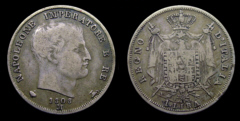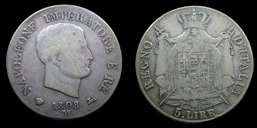 Obv.: NAPOLEONE IMPERATORE E RE. Below, 1808 and M in two lines, between pomegranate and oil lamp. Rev.: Napoleonic coat of arms. Around: REGNO D'ITALIA. Below, 5. LIRE Mm. 37, grs. 25 |