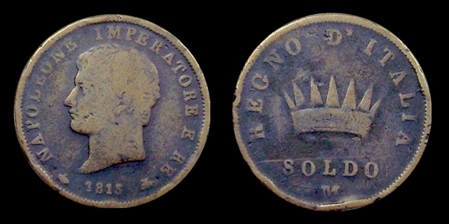 Obv.: NAPOLEONE IMPERATORE E RE. Below, pomegranate, 1813 and oil lamp. Rev.: In the field: Iron Crown. Above, REGNO D'ITALIA. Below, 1 SOLDO and M. Mm. 27,5. grs. 10,95 |