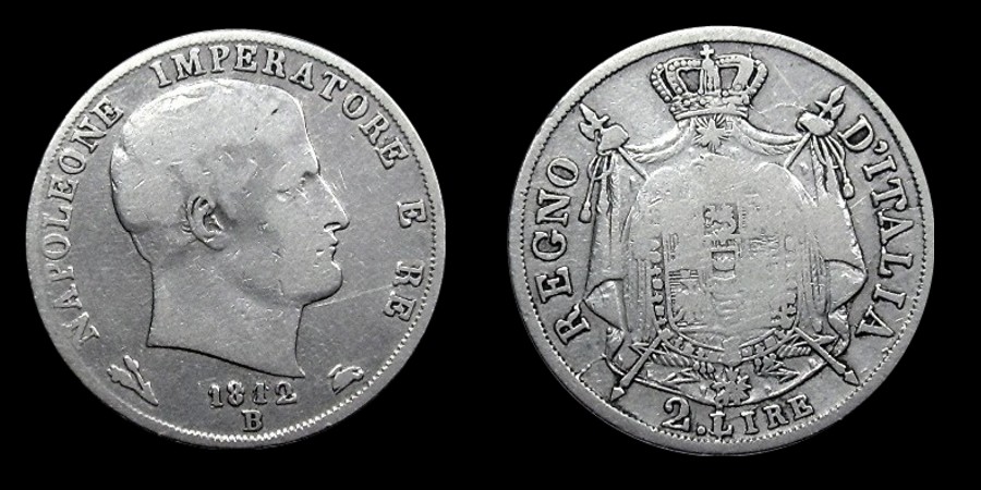 Obv.: NAPOLEONE IMPERATORE E RE. Below, 1812 and B in two lines, between oak branch and oil lamp. Rev.: Napoleonic coat of arms. Around: REGNO D'ITALIA. Below, 2. LIRE Mm. 28, grs. 10 |