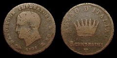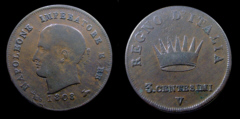 Obv.: NAPOLEONE IMPERATORE E RE. Below, anchor, 1808 and oil lamp. Rev.: In the field: Iron Crown. Above, REGNO D'ITALIA. Below, 3 CENTESIMI and V. Mm. 23,5. grs. 6,3 |