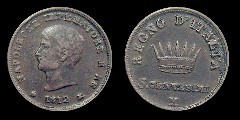 Obv.: NAPOLEONE IMPERATORE E RE. Below, pomegranate, 1812 and oil lamp Rev.: In the field: Iron Crown. Above, REGNO D'ITALIA. Below, 1 CENTESIMO and M. Mm. 19,5. grs. 2,1 |