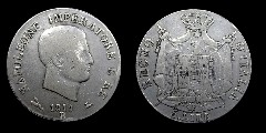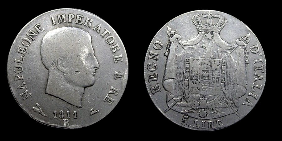 Obv.: NAPOLEONE IMPERATORE E RE. Below, 1811 and B in two lines, between oak branch and oil lamp. Rev.: Napoleonic coat of arms. Around: REGNO D'ITALIA. Below, 5. LIRE Mm. 37, grs. 25 |