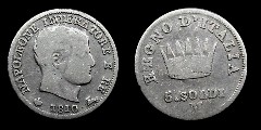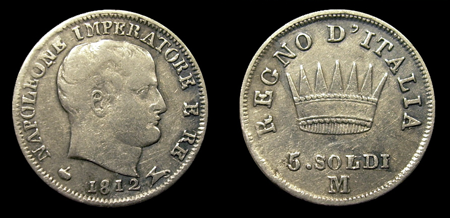 Obv.: NAPOLEONE IMPERATORE E RE. Below, 1812 and M in two lines, between pomegranate and oil lamp. Rev.: Napoleonic coat of arms. Around: REGNO D'ITALIA. Below, 1. LIRA Mm. 23,5, grs. 5 |