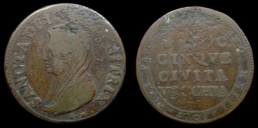 Rev.: In the field: * BAIOC CINQVE CIVITA VECCHIA in four lines; above, a star. Around: PIVS PAPA SEXTVS ANNO XXIII 1797
