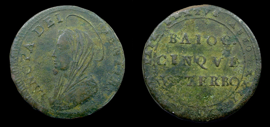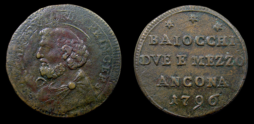Rev.: In the field: BAIOC CINQVE VITERBO on three lines; Around: PIVS PAPA SEXTVS ANNO XXIII 1797
