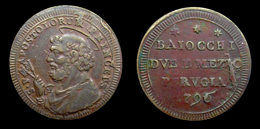 Rev.: BAIOCCHI DUE E MEZZO PERVGIA 1796 in four lines. Above: three stars