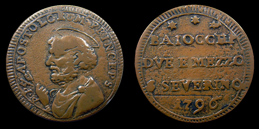 Rev.: BAIOCCHI DUE E MEZZO S. SEVERINO 1796 in four lines. Above: three stars Mm. 29,5, grs. 13,6 |