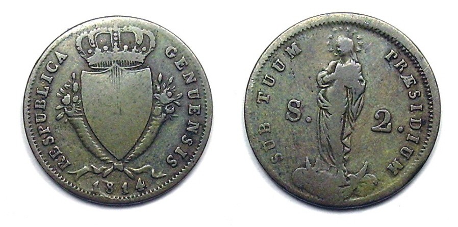 Obv.: Crowned coat of arms between cornucopiae. Around, RESPUBLICA GENUENSIS. Below, 1814 Rev.: The Virgin Mary standing between S. 2. Around, SUB TUUM PRAESIDIUM Mm. 18, grs. 2,19 |