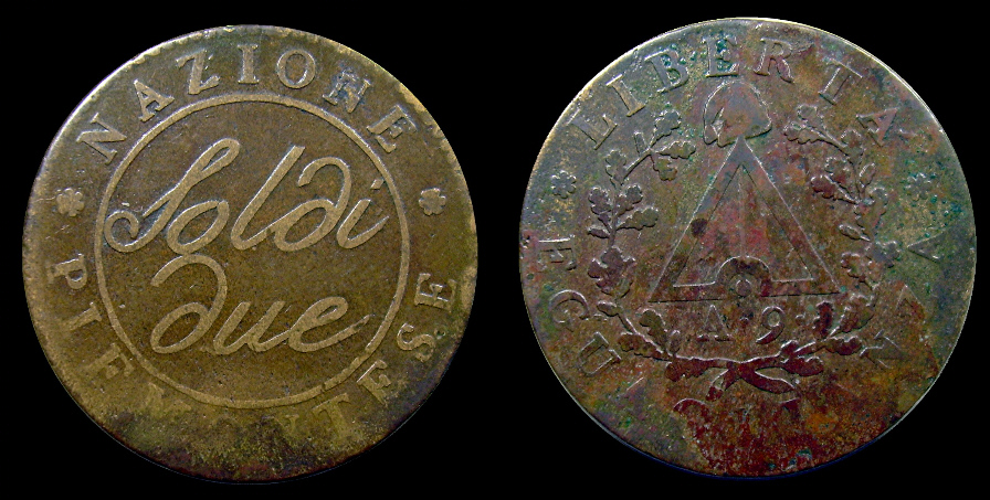 Obv.: Within a circle the value, SOLDI DUE in script. Around: NAZIONE . PIEMONTESE . Rev.: A phrygien bonnet above a triangle surrounded by oak branches. Below the triangle: A. 9. Above: LIBERTA; below: EGUAGLIANZA Mm. 28,5, Grs. 10,8 |