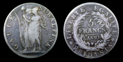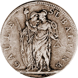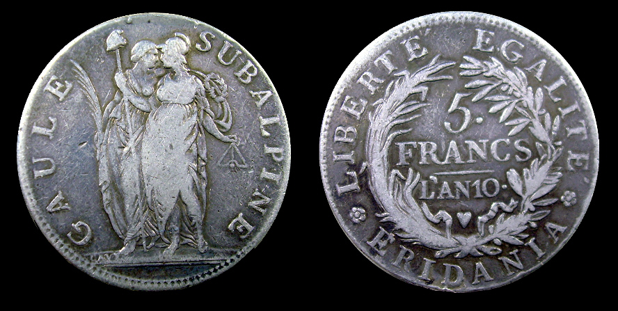 Obv.: GAULE SUBALPINE Rev.: 5 / FRANCS / L'AN 10 / heart, within branches of palm and laurel. Around: LIBERTÉ EGALITÉ rosette ERIDANIA rosette. (The heart is the mark of the Mint Master Vittorio Modesto Paroletti) Mm. 37, Grs. 25 - Engraver: Amedeo Lavy |