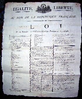 Law of the 18 Brumaire. The first legislative act of the Consulate (Bonaparte, Sieyes, Roger-Ducos). |