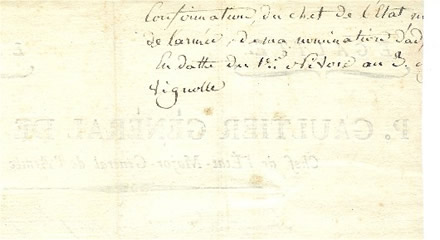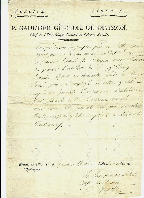Lettre à en-tête du général de division P.GAULTIER, chef de l'état-major général de l'armée d'Italie, datée du 1er Nivôse an 3 soit le 21 décembre 1794 à NICE .