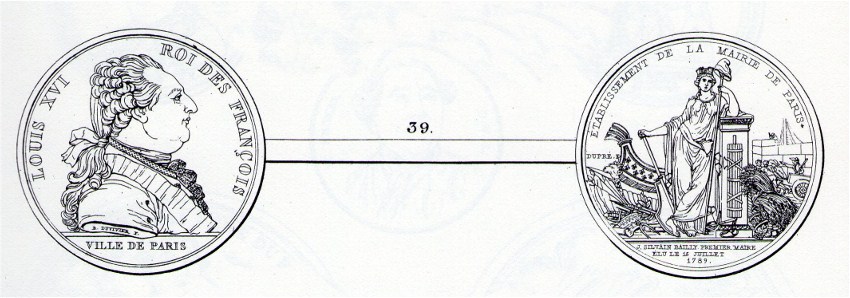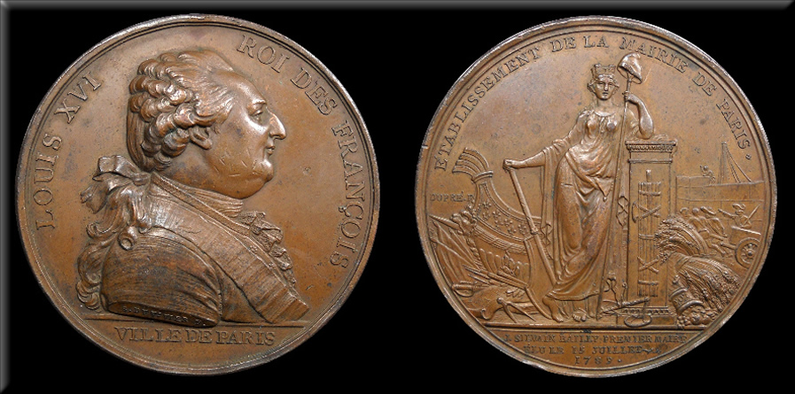 LOUIS XVI ROI DES FRANÇOIS. Buste de Louis XVI à droite. Exergue: VILLE DE PARIS. Sur le bord du bras on lit: B. DUVIVIER F. (Benjamin Duvivier fecit). ÉTABLISSEMENT DE LA MAIRIE DE PARIS. La ville de Paris, la tête tourellé, debout, s'appuyant le coude sur un autel orné d'un faisceau. Elle tient de la main droite un gouvernail et de la gauche une pique surmonteé du bonnet de la liberté. Derrière elle, à gauche, est un vaisseau dont la proue est orneé de fleurs de lis. A ses pieds sont des armes de toute espèce, un rouleau, un compas et la balance de la justice. A droite, on voit une corne d'abondance d'où sortent des fruits, une gerbe, et des ouvriers qui élèvent un édifice. Exergue: J. SILVAIN BAILLY PREMIER MAIRE ELU LE 15 JUILLET 1789. (Jean Silvain Bailly, etc.) Près du vaisseau, dans le champ, on lit: DUPRE F. (Dupré fecit) [53 m]. |
