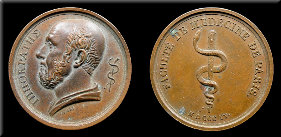 Rev: FACULTÉ DE MEDECINE DE PARIS. Le bâton d'Esculape entouré du serpent. Dessous: MDCCCIX. |