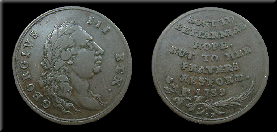 Rev. Inscription above branches of laurel and palm. LOST TO / BRITANNIA'S / HOPE, / BUT TO HER / PRAYERS / RESTOR'D. / 1789 |