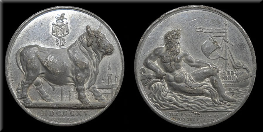 ...OBVERSE. - The Bull, a noble but common animal of the Netherlands, together with the peculiar buildings (Brussels) in the back ground, denote the Low Countries, and the British Standard planted on its ground, the establishment and success of the British arms there in 1815.