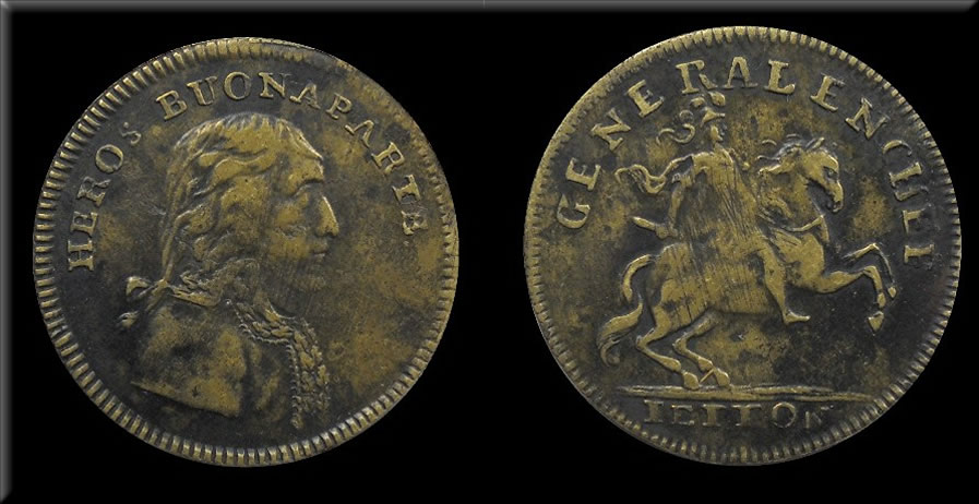 HEROS BUONAPARTE. Buste du général Bonaparte, à droite. GENERAL EN CHEF. Le général en chef Bonaparte, vêtu à l'antique, tenant le bâton de commandement, et à cheval, allant à droite. Exergue: IETTON [25 m ]. |
