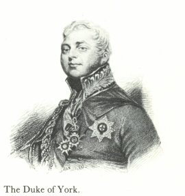 Frederick, Duke of York and Albany (1763-1827), was the second son of the king George III, who appointed him Commander in Chief in 1795. In 1809, he resigned this appointment as result of a scandal caused by the activities of his mistress. In 1811, he was reinstated and played a great part as a backscene administrator in organising the Wellington's victories in Portugal and Spain. |
