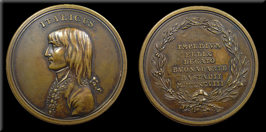 ITALICVS (L'Italique). Buste du général Bonaparte, en uniforme, à gauche. Dans une couronne d'olivier et de laurier: IMPERIVM FELIX LEGATO BVONAPARTE RASTADII MDCCXCVIII. (La France heureuse par la mission de Buonaparte à Rastadt 1798.) [40m]. |