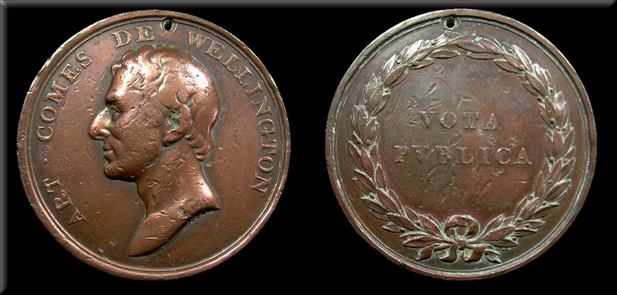 Obv. Bare head of the Duke of Wellington, left. ART. COMES DE WELLINGTON (Arthur, Earl of Wellington). |