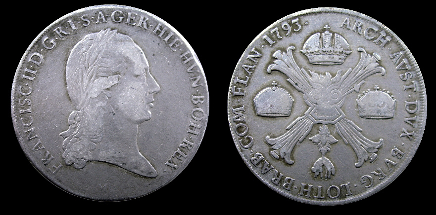 Obv.: FRANCISC. II. D. G. R. I. S. A. GER. HIE. HVN. BOH. REX. Rev.: ARCH. AVSTR. DVX. BVRG. LOTH. BRAB. COM. FLAN. 1793 Mm. 40, grs. 29,52 |