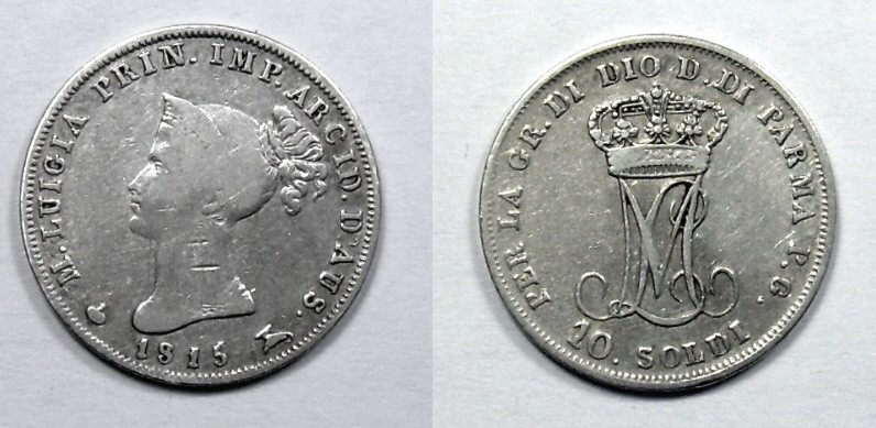 Obv.: M. LUIGIA PRINC. IMP. ARCID. D'AUS. Below, 1815 between pomegranate and oil lamp. Rev.: M and L in crownwd monogram . Around, PER LA GR. DI DIO D. DI PARMA P. G. Below, 10. SOLDI Mm. 18, grs. 2,5 |