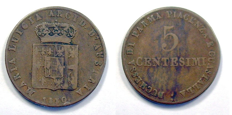MARIA LUIGIA ARCID. D'AUSTRIA. Below, 1830 between two pellets. In the field: 5 CENTESIMI in two lines. Around: DUCHESSA DI PARMA PIACENZA E GUASTALLA. Mm. 27,2, grs. 10 |