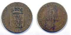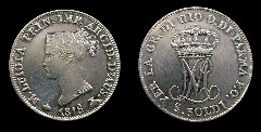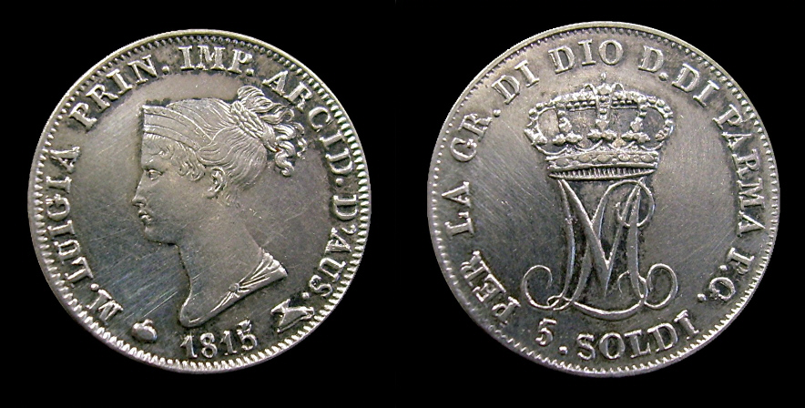 Obv.: M. LUIGIA PRINC. IMP. ARCID. D'AUS. Below, 1815 between pomegranate and oil lamp. Rev.: M and L in crownwd monogram . Around, PER LA GR. DI DIO D. DI PARMA P. G. Below, 5. SOLDI Mm. 15, grs. 1,25 |