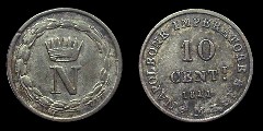 Obv.: Crowned N within laurel wreath Rev.: In the field: 10 CENT.I 1811. Around: NAPOLEONE IMPERATORE E RE. Below, M between pomegranate and oil lamp |