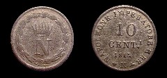 Obv.: Crowned N within laurel wreath Rev.: In the field: 10 CENT.I 1813. Around: NAPOLEONE IMPERATORE E RE. Below, M between pomegranate and oil lamp Mm. 18, grs. 1,9 |