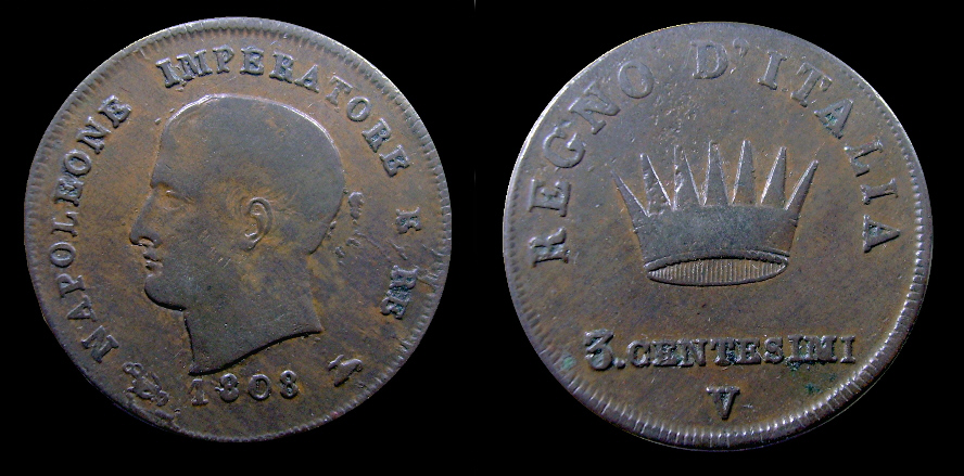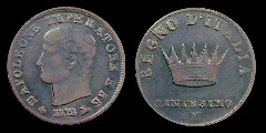 Obv.: NAPOLEONE IMPERATORE E RE. Below, anchor, 1808 and oil lamp. Rev.: In the field: Iron Crown. Above, REGNO D'ITALIA. Below, 3 CENTESIMI and V. Mm. 23,5. grs. 6,3 |