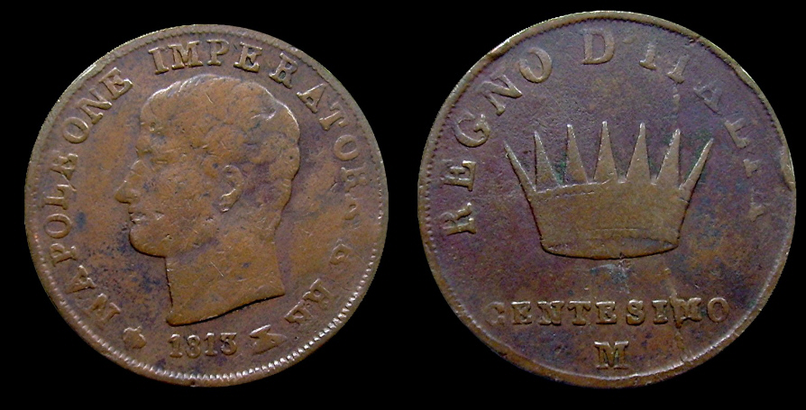 Obv.: NAPOLEONE IMPERATORE E RE. Below, pomegranate, 1813 and oil lamp. Rev.: In the field: Iron Crown. Above, REGNO D'ITALIA. Below, 1 SOLDO and M. Mm. 27,5. grs. 10,95 |