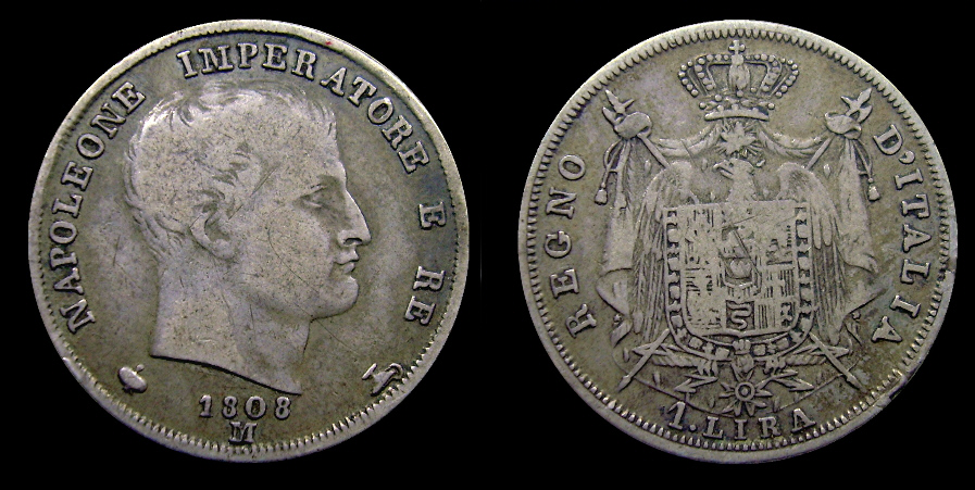 Obv.: NAPOLEONE IMPERATORE E RE. Below, 1808 and M in two lines, between pomegranate and oil lamp. Rev.: Napoleonic coat of arms. Around: REGNO D'ITALIA. Below, 1. LIRA Mm. 23,5, grs. 5 |