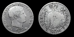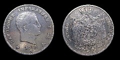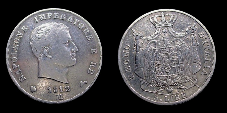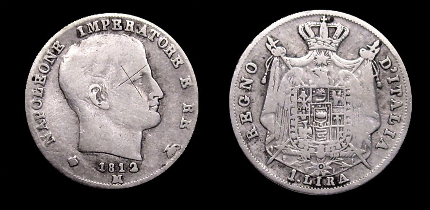 Obv.: NAPOLEONE IMPERATORE E RE. Below, 1812 and M in two lines, between pomegranate and oil lamp. Rev.: Napoleonic coat of arms. Around: REGNO D'ITALIA. Below, 1. LIRA Mm. 23,5, grs. 5 |