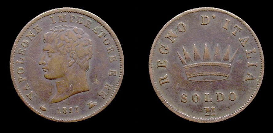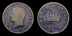 Obv.: NAPOLEONE IMPERATORE E RE. Below, pomegranate, 1811 and oil lamp. Rev.: In the field: Iron Crown. Above, REGNO D'ITALIA. Below, 1 SOLDO and M. Mm. 27,5. grs. 10,95 |