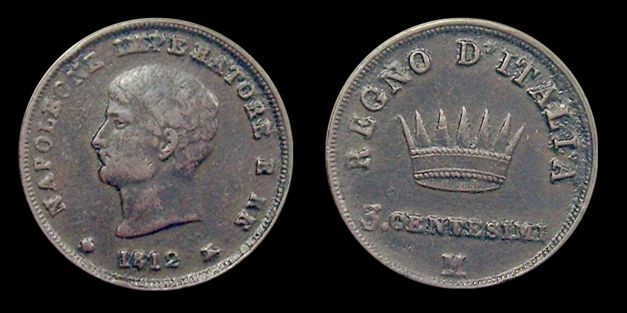Obv.: NAPOLEONE IMPERATORE E RE. Below, pomegranate, 1812 and oil lamp. Rev.: In the field: Iron Crown. Above, REGNO D'ITALIA. Below, 3 CENTESIMI and M. Mm. 23,5. grs. 6,3 |